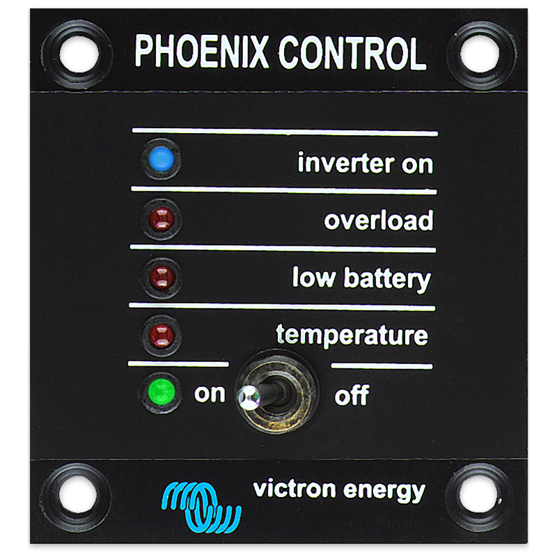This panel is intended for Phoenix Inverters equipped with a UTP remote monitoring and control socket. It can also be used on a MultiPlus Inverter/Charger when an automatic transfer switch but no charger function is desired. The brightness of the LEDs is automatically reduced during night time. Only for models: 12/1200, 12/1600, 12/2000, 12/3000, 12/5000, 24/1200, 24/1600, 24/2000, 24/3000, 24/5000, 48/3000 and 48/5000.